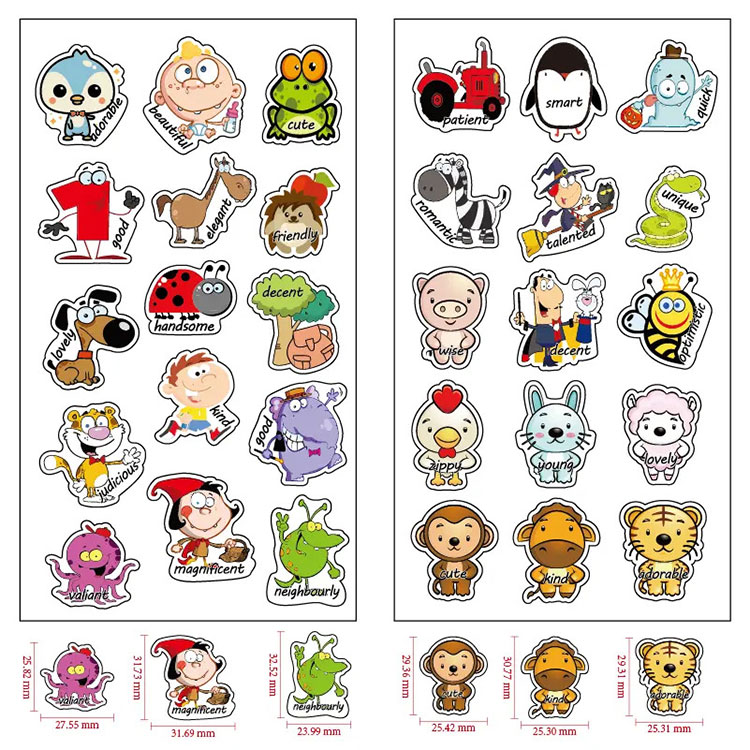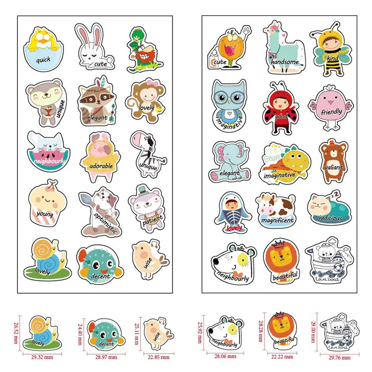 Højkvalitets tegneseriebelønningsklistermærker fra den kinesiske producent JOJO Pack. tegneserie belønning klistermærker badge tema designs. perforeret design, let at rive i stykker og efterlader ingen rester. Disse klistermærker kan bruges til udendørs sport og fester med klasseværelsestema. De vil give børn og voksne en uendelig sjov. Du kan også bruge dem som præmier til udendørs sportsspil.