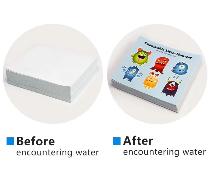 Når den nedsænkes i vand, bliver den straks til en pastalignende tilstand og spreder sig hurtigt. Farverne trykt på den spredes og deformeres derefter. Farveændringsprocessen er irreversibel. Når den er udsat for vand, vil den permanent vise farven.
