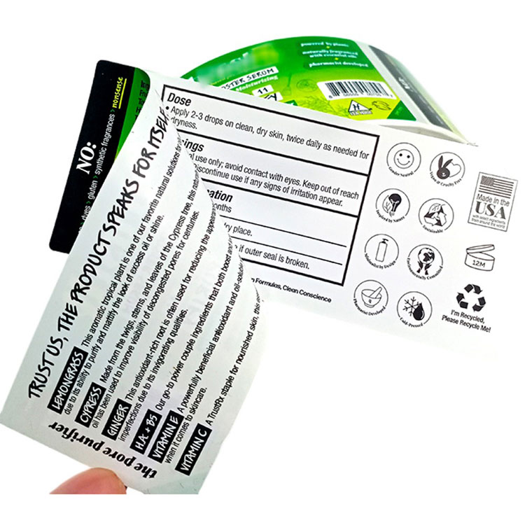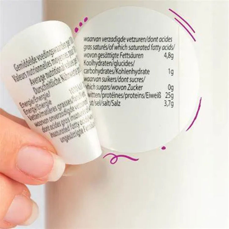 Disse fødevare-flerlagsetiketter er fremstillet og leveret af JOJO Pack i Kina. Disse etiketter er stablet og sammensat, så de ligner almindelige selvklæbende etiketter udefra. Etiketterne kan dog gentagne gange rives og indsættes lag for lag, ligesom at vende siderne i en bog, så du kan se indholdet udskrevet på hver etiket.