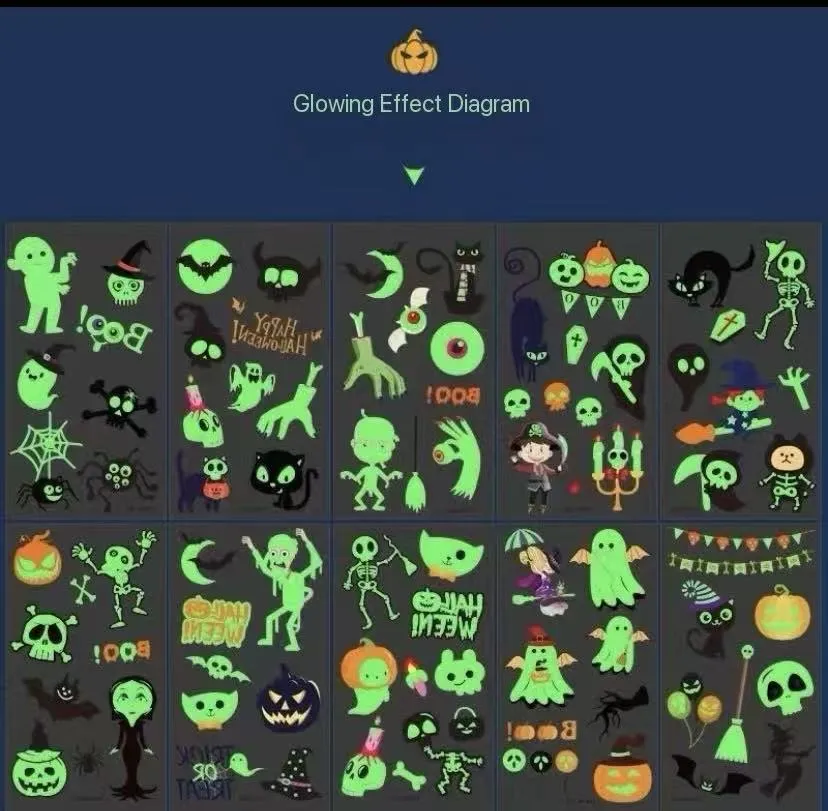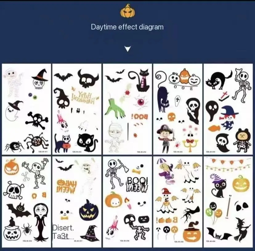 Halloween Night Glow Tattoo -klistermærkerne produceret af JoJo Pack er unikke dekorationer, der er specielt designet til denne mystiske og glade festival, med en rig række Halloween -elementer. Disse mønstre er ikke kun enkle dekorationer; De integrerer perfekt Halloween -atmosfæren, hvilket gør dig til centrum for opmærksomheden under festivalen.