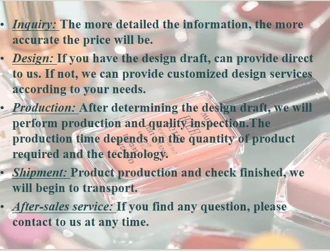Med sin rige erfaring og avancerede teknologi producerer JoJo Pack tilpassede neglelaketiketter, der er elsket af kunder. Dette er ikke kun fordi vores produkter er høj kvalitet og lav pris, men også fordi vi leverer intime tjenester såsom tilpassede tjenester, konsulenttjenester og eftersalgsservice. Hvis du også er interesseret i vores produkter. Kontakt os.
