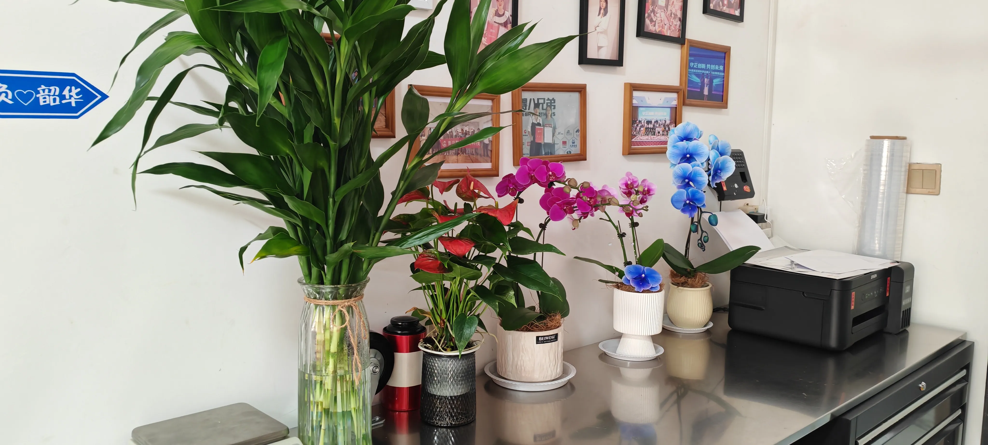 Gå indJOJO Pack'skontor. Der er tre gryder med phalaenopsis på begge sider af receptionen. Deres blade er spredt ud og lige, ligesom sommerfugle, der skal flyve væk. De tilføjer et strejf af elegance og ynde til virksomheden. Den grønne dracaena sanderiana fjerner kontorets sløvhed. Mange medarbejdere tiltrækkes af forandringerne her, så snart de ankommer til virksomheden. De stopper for at nyde og tage billeder med deres mobiltelefoner.