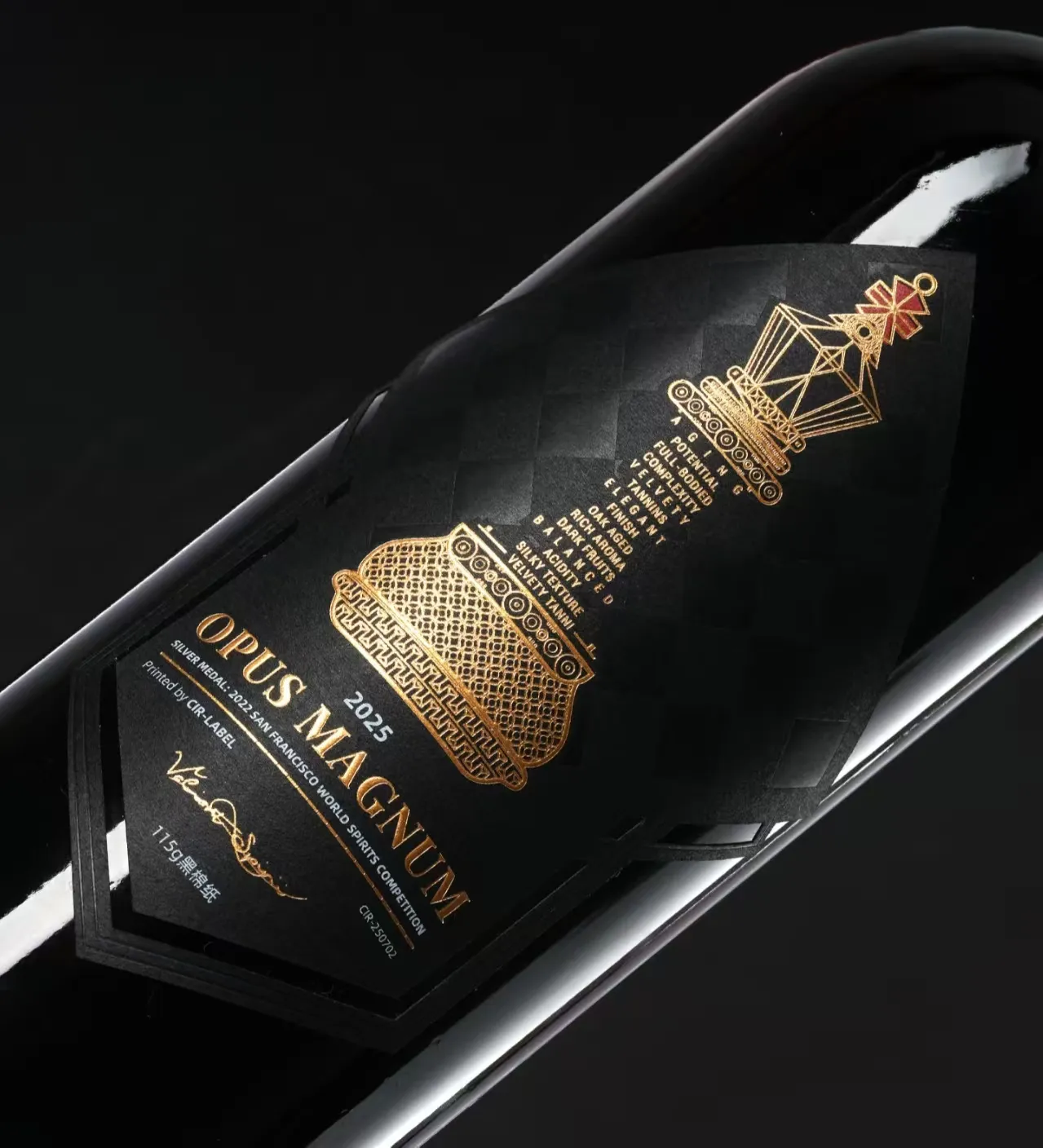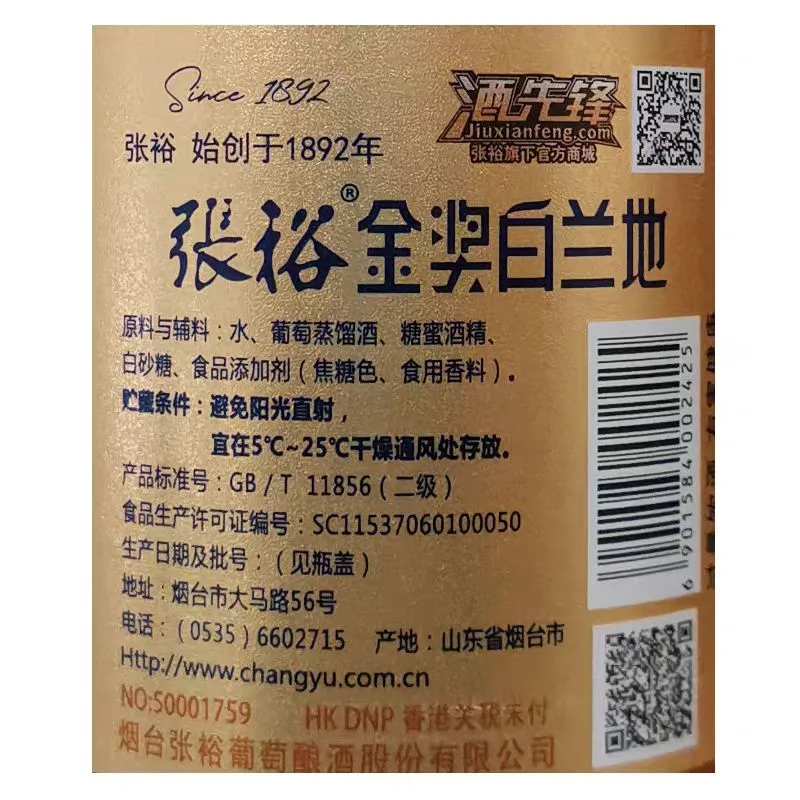 Denne brandyvin etiketudnytter glansen fra aluminiumsfolie til at skabe en strålende glød. Mærkenavnet og produktnavnet, som er fokuspunkterne, er fremhævet. Hele etiketten har en kornet, mat finish, og den matte effekt forstærker etikettens følelse af luksus og sofistikering. Disse teknikker er især vigtige for vinmærker, der retter sig mod det eksklusive marked.