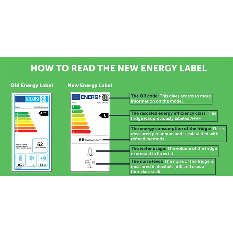 Køleskabs energieffektivitetsmærkerer skilte, normalt lavet af holdbare materialer, med karakteristiske farver og grafik for nem identifikation.Køleskabs energieffektivitetsmærkerindeholde ikoner for energieffektivitetsniveauer, normalt ved hjælp af et bogstav- eller stjerneklassificeringssystem, for tydeligt at demonstrere køleskabets energiforbrugsydelse.