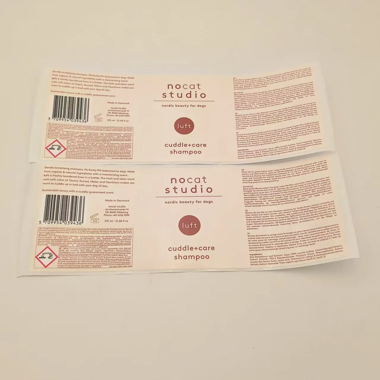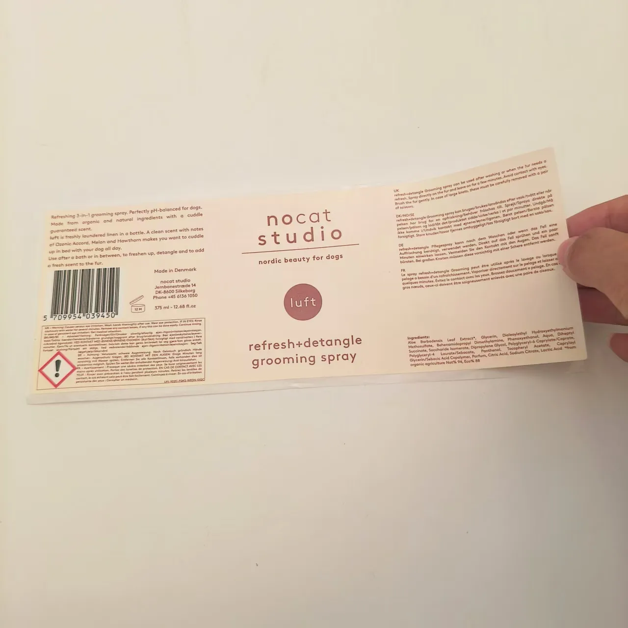 Jojopack Company har specielt designet en avanceret etiketopløsning til kæledyrsbalsam. Vores sprayflaskeetiketter er lavet af vandtæt og tårebestandigt materiale, og produktmærket kan opretholde en lys og varig farve, selv i et fugtigt miljø. Etiketten indeholder oplysninger såsom produktnavn, ingredienser, sikkerhedsinstruktioner, funktioner og forholdsregler og er arrangeret på en ordnet måde, hvilket hjælper mærket med at forbedre dets visuelle konkurrenceevne.